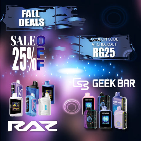 VETRANS DAY SALE SAVE 25% OFF ON GEEK BAR & RAZ VAPES.